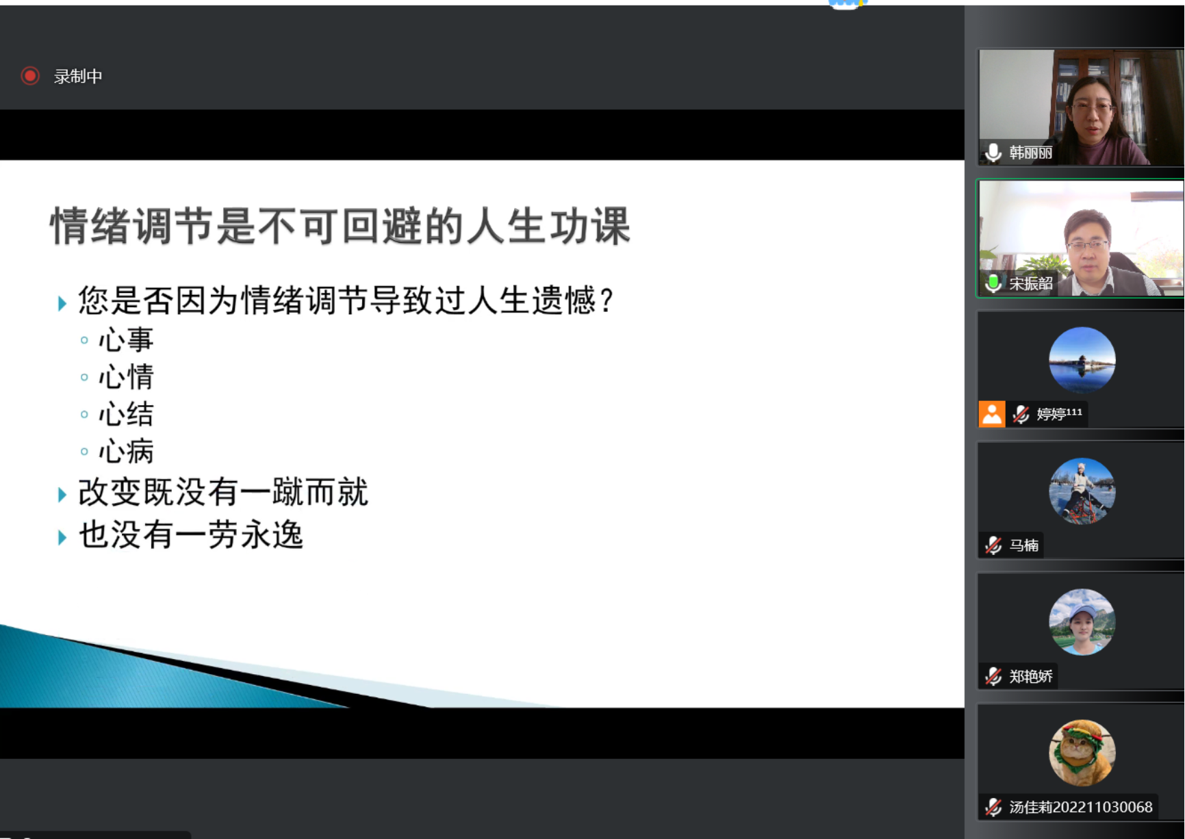 宋老师以扎实的传统文化基础、心理学理论素养和丰富的高校心理咨询经验,为学院师生做了一堂内容丰富、讲解生动的讲座,帮助参会师生了解到情绪调节是人生不可避免的功课,是一个持续修炼的过程,需要学习掌控内心世界的智慧,并为学院师生自我管控情绪提供了修心、修身的思路与4A法、觉察四步法等方法。