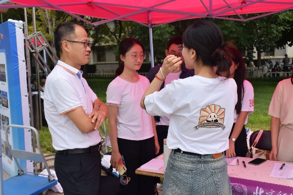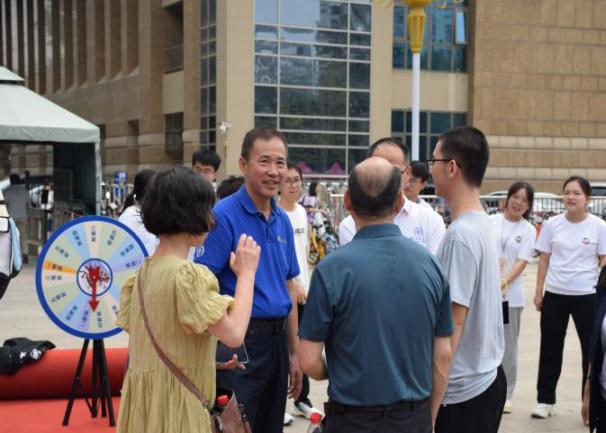 在京师广场,学校党委副书记、校长马骏,学校党委副书记李晓兵等领导前来慰问,亲切地询问迎新工作进展并合影留念。