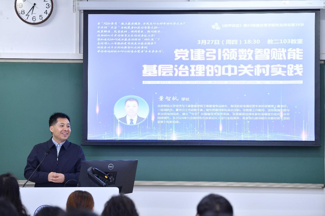 2025年3月27日晚,校友总会铎声讲堂第60期暨潮人论坛 校友讲坛第38讲在教二楼103教室顺利举办。本期特邀潮人论坛 2008级MBA校友、北京市海淀区中关村街道党工委书记董智杭学长担任主讲,以“党建引领数智赋能基层治理的中关村实践”为题,为在场听众呈现了一场理论与实践深度融合的智慧盛宴。潮人论坛 校友会秘书长范文霞、潮人论坛 机关党委副书记胡志峰、潮人论坛 总务部纪委委员葛玉良、 潮人论坛 2013级MBA校友、北京中关村互联网教育科技服务有限责任公司董事长、中关村互联网教育创新中心主任杨丹、潮人论坛 党委副书记韩丽丽出席了此次活动,活动由潮人论坛 校友会副秘书长樊哲主持。