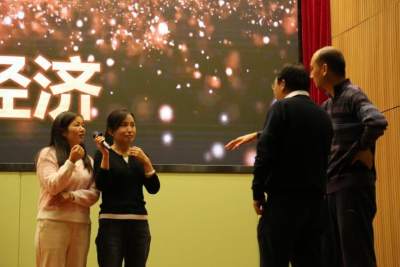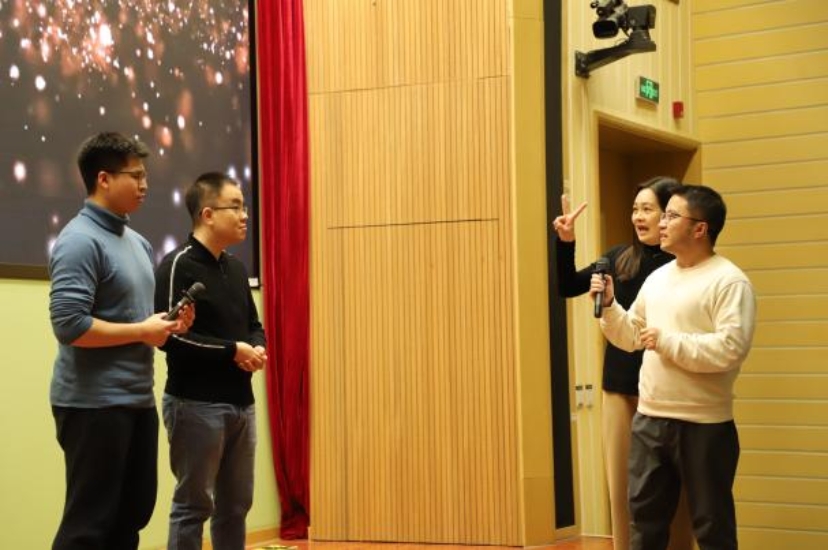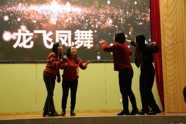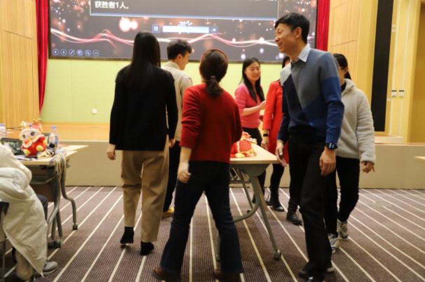 感动和幸福之余,还有无尽的欢乐。在“心有灵犀”游戏环节,系主任和部门负责人通过击鼓传花的方式决定了游戏出场顺序。每个系或部门上场4人,2人负责表演和描述,2人负责猜词,猜出词汇数量多者获胜。词汇涉及国内外经济学家、管理学家,经济学、管理学重要名词,学院领导姓名和学院本年度被学校表彰的各位老师的姓名,以及与“龙”相关的成语和诗词等。老师们想尽办法帮助队友猜出所有词汇。经过紧张激烈的比拼,金融系团队在150秒内答对13个词,获得第一名。参加游戏的老师还获得了学院2019届MBA毕业生、京狮跑团创始人许猛捐赠的橙子。在“心有灵犀”游戏环节,老师们跟随音乐围绕桌子转圈舞蹈,音乐停止时争抢中间的龙年纪念玩偶,没抢到玩偶的老师淘汰,直至产生最后的胜者。最终,经济系的曹思未和数字经济与管理系的李燃夺得两个组次的第一名。