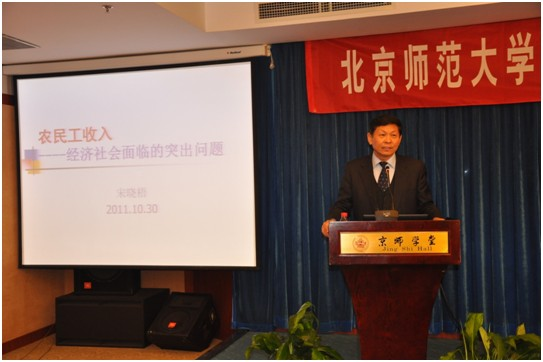 在随后的研讨会上,宋晓梧、李实分别就农民工收入分配问题以及中国收入分配问题的现状、原因与政策选择等问题进行了主题演讲。宋晓梧从农民工收入分配现状、收入分配中存在的问题、对收入水平和分配的满意度、农民工群体特别是新生代农民工在社会群体中的定位等方面介绍了我国农民工收入的情况。李实老师介绍了当前中国居民收入分配的总体情况。中国居民收入分配差距在过去的十年间呈现出不断扩大的趋势。已经达到并超过了国际公认的收入差距的警戒线。从社会角度看,收入分配差距过大对社会的和谐稳定存在重大影响。绝大部分的公众都认为现在的收入分配情况是不太公平的或很不公平的。收入差距扩大被认为是当前社会最不和谐的因素之一。收入分配差距问题需要运用多种政策工具相互配合才能加以解决。