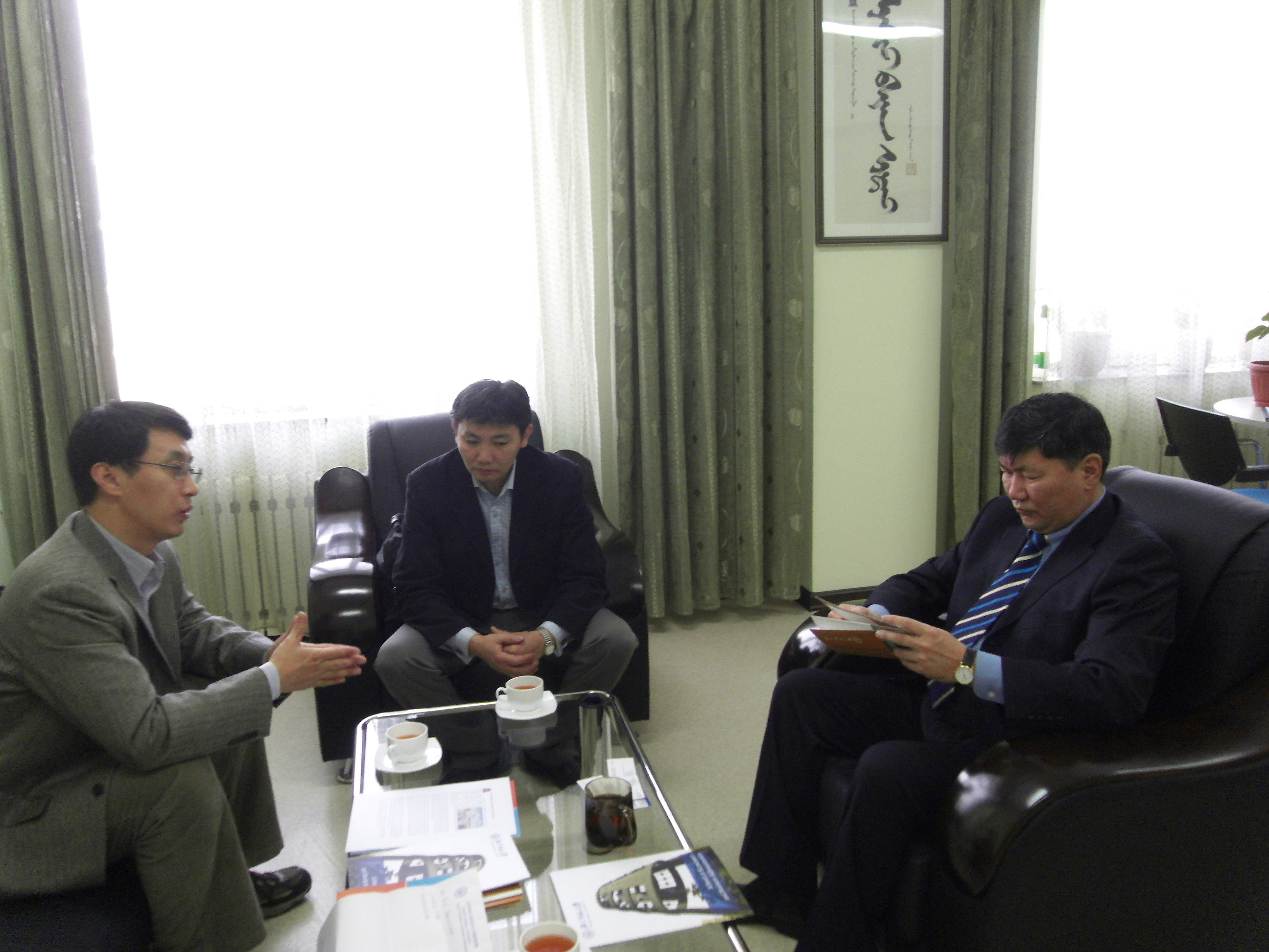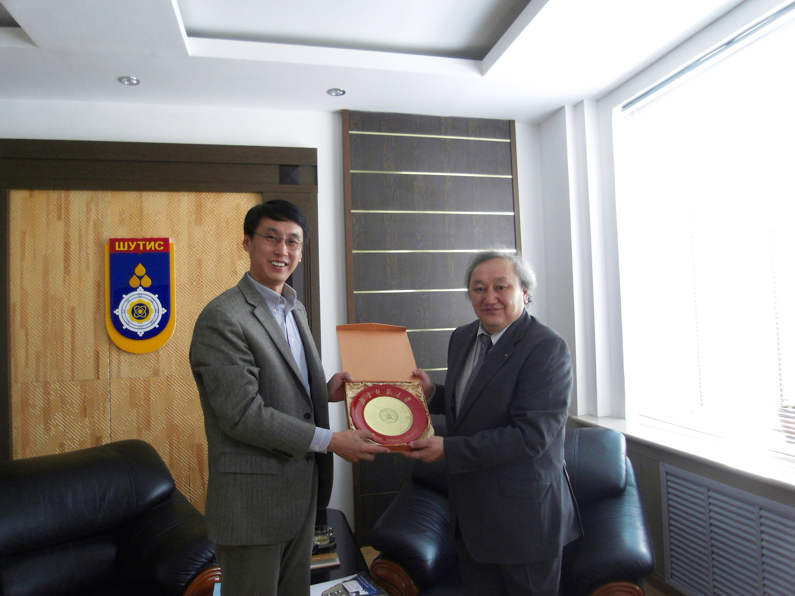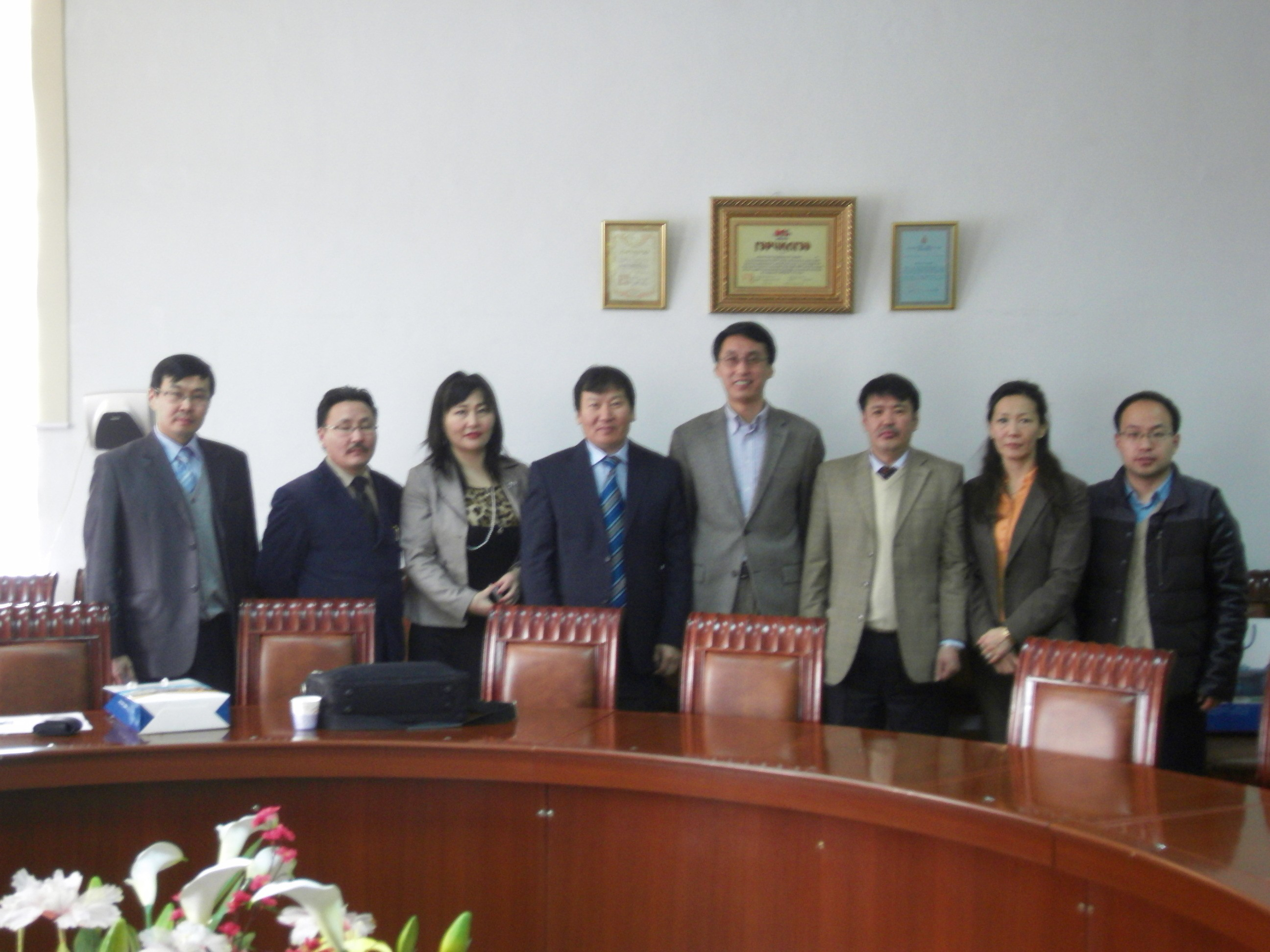 到访,参加会见的有第一副校长TSOG-OCHIP教授、学校研究生院院长、教务处处长、财务处处长、外事办主任和副主任,并由该校外国语学院院长担任翻译。TSOG-OCHIP副校长首先向我方介绍了蒙古国立师范大学的基本情况,总结了该校在过去国际化工作中采用的学生短期交流(特别是硕士生、博士生的互访)、教师交流和培训等途径及其取得的良好效果,同时明确表达了与我校、院展开全面合作的强烈愿望。杨澄宇教授对TSOG-OCHIP副校长等出席会见表示感谢,详细介绍了我校、院的基本情况,并侧重推出WEC项目,希望以此启动双方的全面合作。会谈结束时,双方互赠了纪念品。