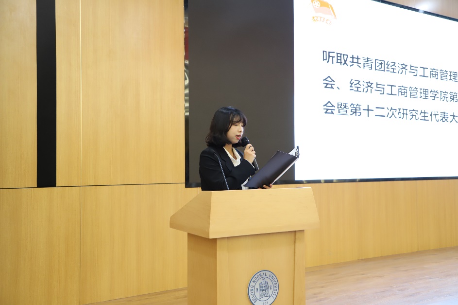 学院院长戚聿东老师致开幕词。他在讲话中充分肯定了院内各级团组织的工作,过去一年,学院团学组织积极响应党的号召,聚焦学院同学发展需求,在思想引领、校园文化、生涯发展、社会服务等方面做了大量的工作,取得了丰硕的成果。并对全体学生代表和新一届团学研会提出了三点希望:第一,希望各位同学坚定理想信念,树立远大理想,努力成长为有理想、敢担当、能吃苦、肯奋斗的新时代好青年;第二,希望全体学生能够锤炼过硬本领,努力增长才干,不断提高与时代发展和事业要求相适应的素质和能力,让勤奋学习成为青春远航的动力,让增长本领成为青春搏击的能量;第三,希望新一届团学研代会锐意创新工作,切实服务同学,通过精心策划的学生活动打造“京师风范”的校园文化,为同学们营造良好的成长环境和氛围,助力同学们的成长成才。