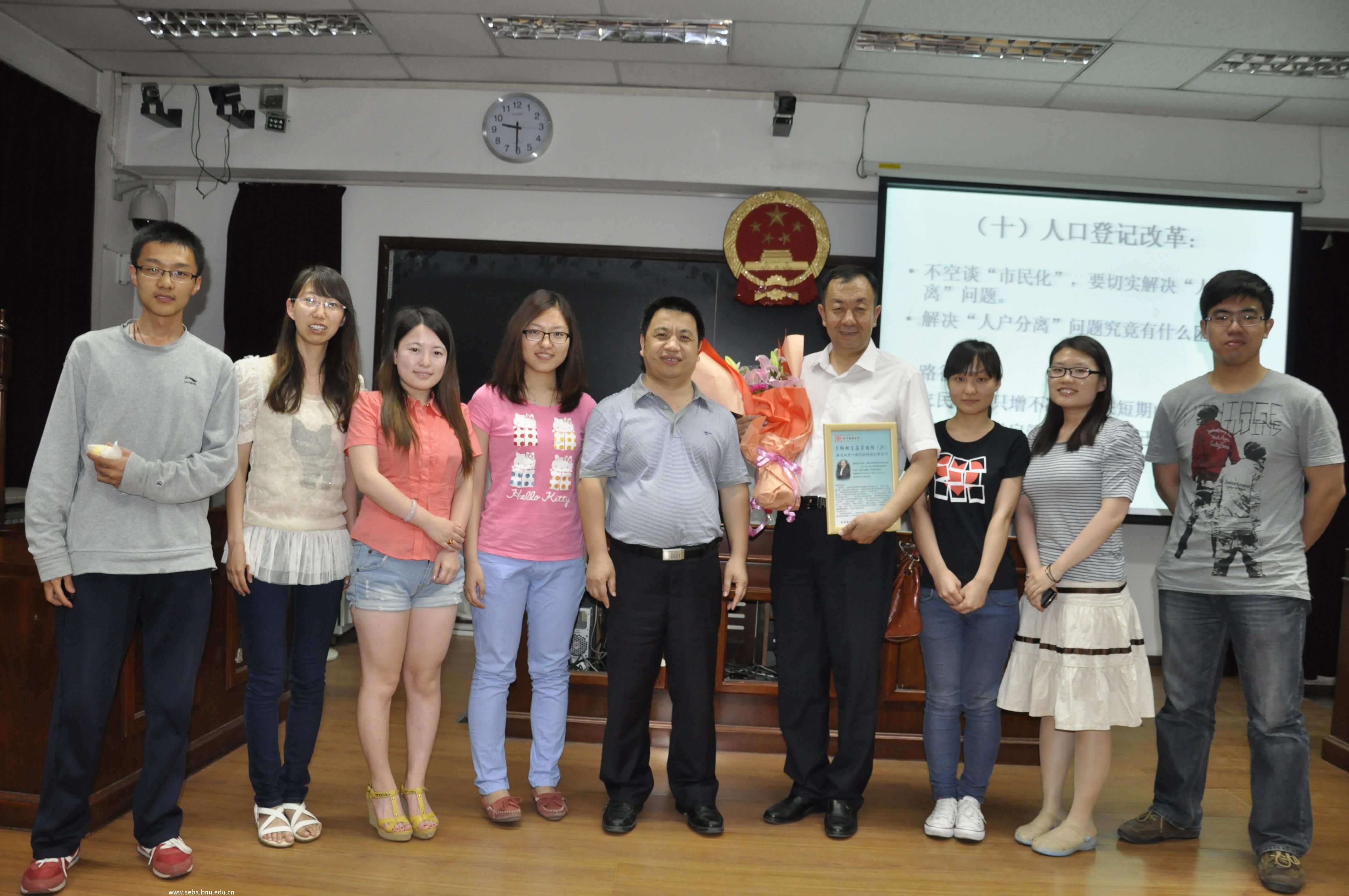 演讲结束后同学们积极提问,现场气氛活跃,党老师一一耐心的给出了令人信服的解答。最后,研会同学将精心准备的纪念品和鲜花赠送给党国英老师,并邀请党老师与研究生会同学合影留念。