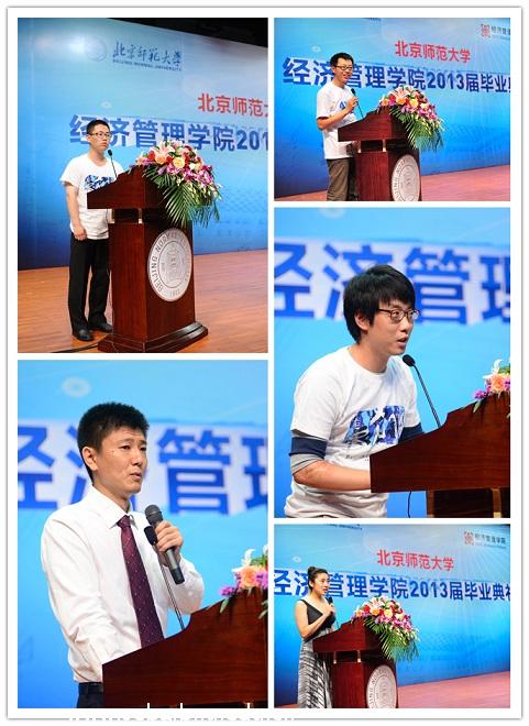 而后,由毕业生代表发言。先是本科生代表高任飞同学发言,从见证师大四年的变化中,表达了深刻的感慨和感谢,感谢母校、学院领导和老师、父母及家人,最终以一首《虞美人·毕业》与各位同学共勉。然后由硕士研究生代表张吉良同学发言,在回过头来看研究生涯的时候,收获了相当的财富;展望未来,无限憧憬,并将铭记“京师经管”四个永恒的字眼。MBA学生代表赵可石接下来发言,在自己解读了经管院训“经邦济世,励商弘文”的基础之上,来反思自己曾经的师大生涯、憧憬即将踏入的新的征程,在广阔的天地中去施展丰富学识、聪明才智和远大抱负。留学生代表柳善烈同学发言,从入学时不同文化的融入、中国留学梦的实现、积极参与的各项活动展现了在师大的生活。最后,由学生家属代表上台发言,作为潮人论坛