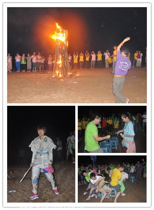 在海风徐徐吹来的沙滩上,在熊熊燃烧的篝火边,伴着欢快的音乐,篝火晚会热闹开场,学生们随着音乐起舞,沉浸在欢乐的海洋中。支援前线、疯狂抢凳子、Newspaper Fashion Show等环节的展开,不仅增进了团队成员间的沟通与融合,更使学生们充分展示自我、增强了解。