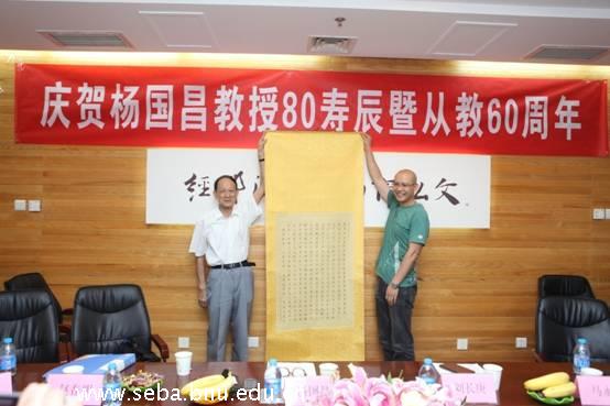 此次庆祝活动是杨国昌教授的弟子自发组织,为庆祝杨国昌教授80寿辰暨从教60周年而特别精心筹划的。出席活动的弟子们都与杨老师有着极为深厚的感情,从入学时饱含对知识的无限渴望,到走进师大校园,聆听恩师的谆谆教诲,而今在各行各业已卓有成就。此刻,弟子们聚集在恩师身旁,追忆求学生涯的点点滴滴,感激多年来的培养和教诲,汇报各自的发展现状和取得的成就。大家一致认为,恩师的学术思想、学术品格、学术精神和谆谆教诲使各位弟子终生受益,代代传承,钟伟教授代表全体弟子向恩师赠送他珍藏多年的心经一幅。