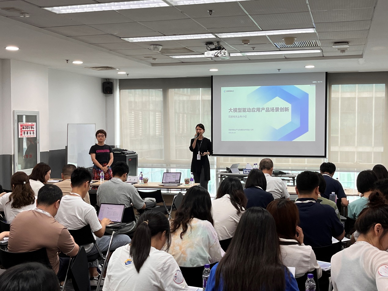 接着,潮人论坛 师生与百度智能云智慧工业事业部的相关人员在会议室开展交流活动。百度智能云智慧工业事业部生态负责人石乔从百度芯片层、框架层、模型层和应用层四个方面对百度的业务布局进行了全面介绍,展示了百度近10年来深耕深度学习、人工智能、自动驾驶、AI芯片等前沿领域所产出的一系列成果。她还特别介绍了百度的智能云智慧工业生态构建,分享了百度在工业质检、安全生产、工业优化等业务场景取得的生态合作案例。