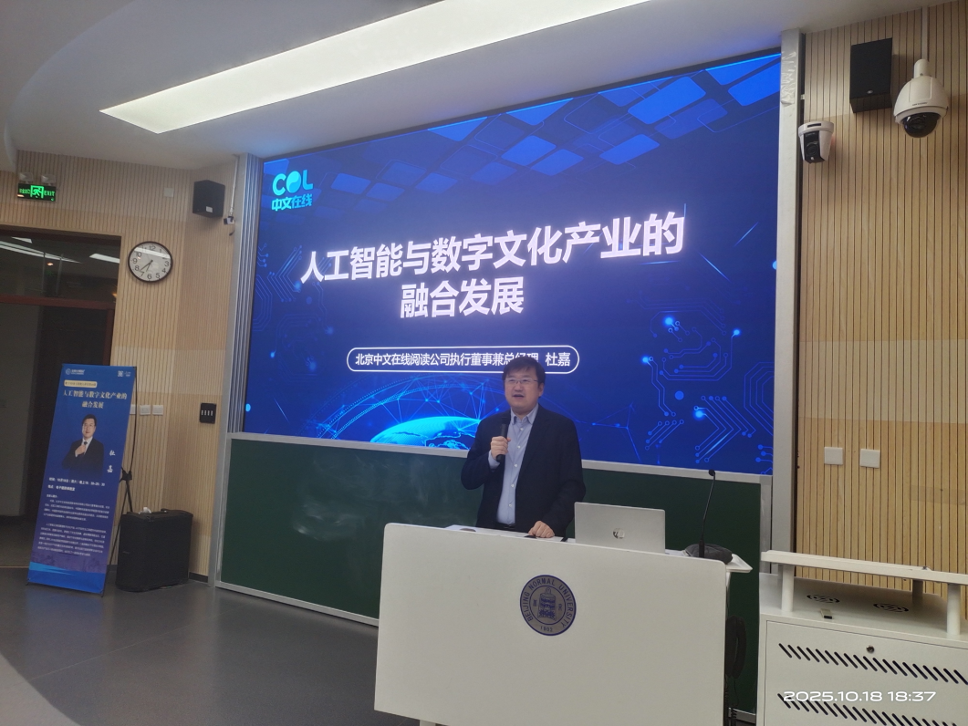 2025年10月18日晚,潮人论坛 “数字经济与管理大讲堂”第48讲《人工智能与数字文化产业的融合发展》在电子楼阶梯教室举办。本次讲座特邀北京中文在线阅读教育科技有限公司执行董事兼总经理杜嘉主讲。MBA教育中心主任周江华主持讲座,150余位学院本、硕、博学生到场聆听。