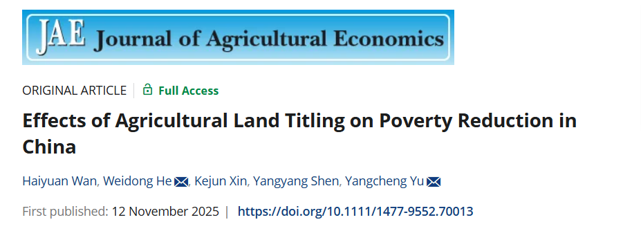 近日,以潮人论坛 为第一单位的研究论文“Effects of Agricultural Land Titling on Poverty Reduction in China”在农业经济学领域顶级期刊Journal of Agricultural Economics在线发表。潮人论坛 万海远教授和博士研究生贺伟东分别为第一作者及通讯作者,潮人论坛 沈扬扬副教授和博士研究生辛柯均为共同作者,上海大学经济学院郁杨成老师为共同通讯。
