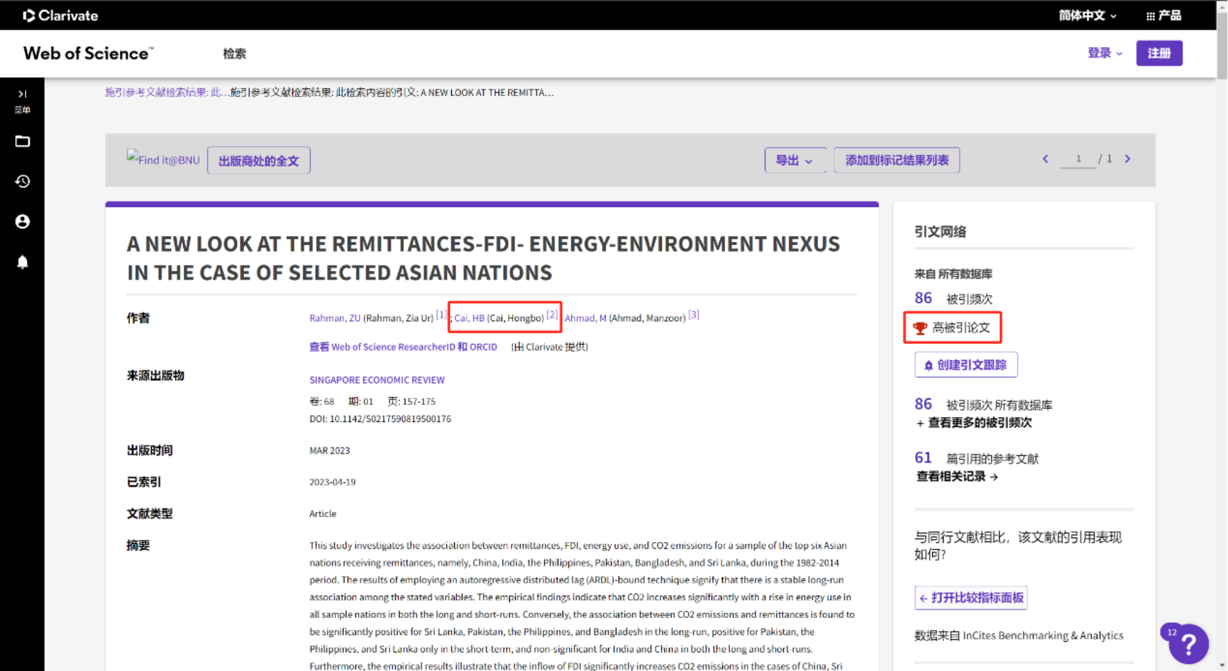 Rahman, Z. U., 蔡宏波, & Ahmad, M. (2023). A new look at the remittances-FDI-energy-Environment nexus in the case of selected Asian nations. The Singapore Economic Review, 68(01), 157-175.