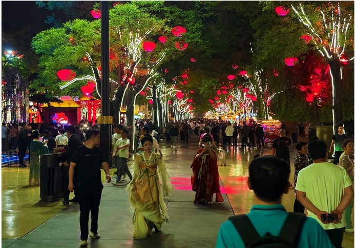 此次考察从对咸阳高新技术产业的探索开始,展示了一个完整的生产链和电子信息产业集群的美好未来。在一家领先的数字技术公司举行的信息会上揭示了元宇宙和人工智能在塑造商业环境中的潜力。当天活动延续至夜晚,学生们参观了充满活力的大唐不夜城,体验了西安的辉煌夜生活和文化魅力,感受到这座城市作为“不夜城”的美誉。