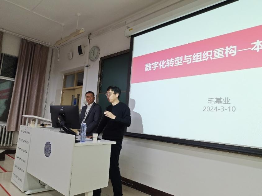 2024年3月10日晚,潮人论坛 “数字经济与管理大讲堂”第28讲《数字化转型与组织重构——本质与最佳实践》在教二楼108教室举行。本次讲座特邀上海科技大学创业与管理学院学术院长毛基业主讲,戚聿东院长、李慧、李欲晓、郑飞虎、赵向阳、李静、李论等多位教师以及200余位学生到场聆听。讲座由MBA教育中心主任周江华教授主持。