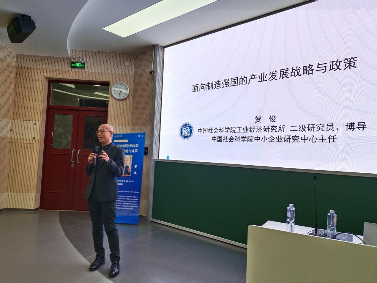 2023年11月26日晚,潮人论坛 “数字经济与管理大讲堂”第24讲《面向制造强国的产业战略与政策》在电子楼阶梯教室举办。本次讲座特邀中国社会科学院工业经济研究所二级研究员、博导、中国社会科学院中小企业研究中心主任贺俊主讲, MBA教育中心副主任李静主持,近200名学生到场聆听。