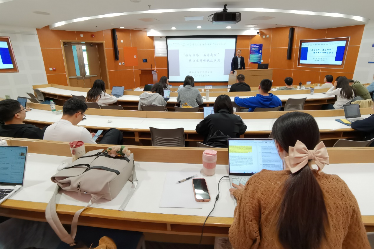 活动聚焦科研思维构建、学术论文发表与高校求职等核心议题,通过专题分享与师生对话展开深入交流。李凯杰教授以“科研与教职发展的一点点体会”为题,结合读博期间和工作后的切身经历,从经济学博士生、CSSCI期刊编辑部主任、学院院长等多个角色的详细案例入手,为在场博士生在论文写作与投稿,以及求职等方面的提供细致的建议与指导。
