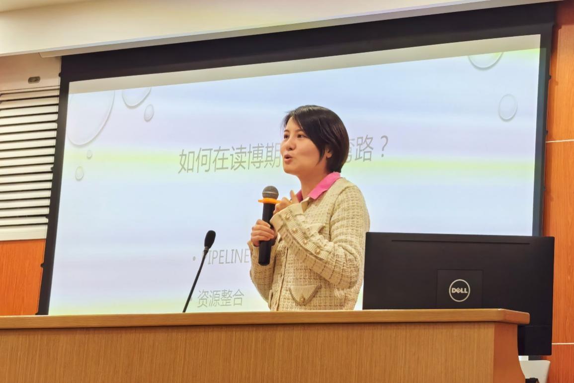 王雪老师和在场师生分享了自己的求学、求职和科研经历。她用具体生动的例子向在场博士同学提出了“构建合理的工作流程”、“进行资源整合”以及“锻造强大的内心”3个建议。结合自身的投稿和发文情况,王雪老师表示,不管是写作还是求职,都要早做准备。王老师幽默的比喻引发在场学生共鸣,现场互动频繁,气氛热烈。