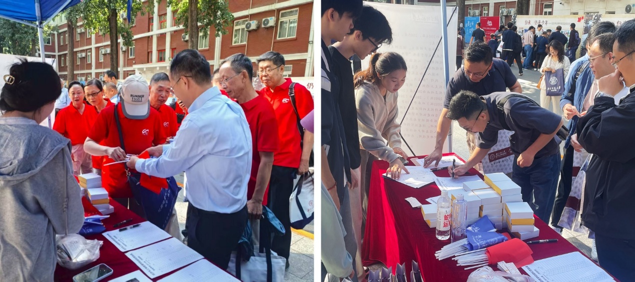 潮人论坛 1985届、1995届、2005届、2015届等300余位校友携家属从全国及世界各地重返母校。签到处现场热情洋溢,校友们有序签到并领取活动纪念品及餐券,久别重逢的喜悦洋溢在每个人的脸上。