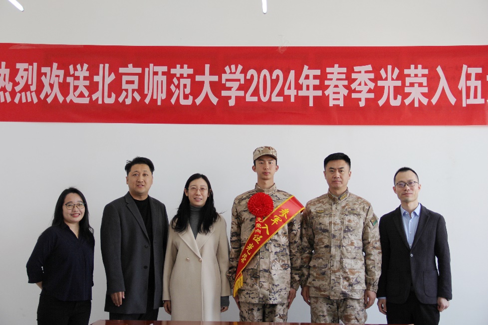 图为慰问并欢送学院2024年春季入伍学生吴柳俊笙