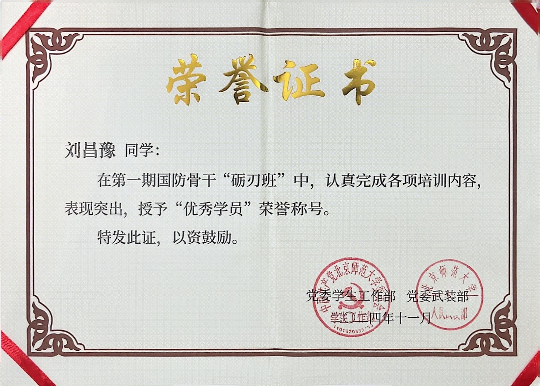 图为刘昌豫同学获评第一期国防骨干“励刃班”“优秀学员”荣誉证书