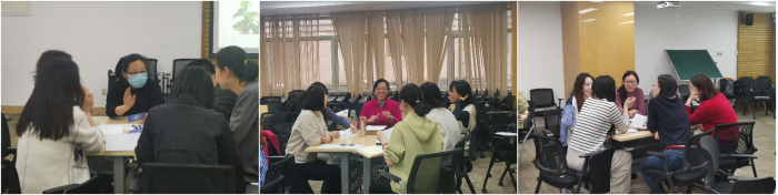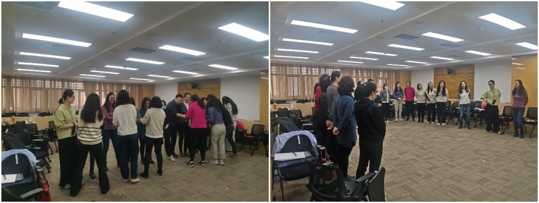 江燕老师通过五个与工作相关的游戏,巧妙地拉近了老师们的距离,活跃了现场氛围。五个小游戏从打破界线、自我接纳、工作亮点、状态优化与互相欣赏多个维度,让老师们更好地认识了自己与工作伙伴。过程中,老师们通过游戏被巧妙分为三组,在组内利用道具卡片分别进行互相称赞、自我评价,分享自己工作中最有成就感的时刻与最佳的工作状态,同时也对同组老师进行依次夸奖。现场气氛热烈,不时传来欢声笑语。