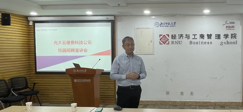 随后,李根经理对实习生联合培养项目进行详细讲解,使同学们初步了解实习项目的培养周期、选拔条件与实习岗位,以便更好地参与后续的简历投递与面试选拔环节。李经理强调,无论是从事平台运营还是产品研发,对于大学生而言,实际工作中最为重要的是实现“从校园到职场”的转变。这需要同学们不断增强自身的学习能力,强化在实践中不断学习的意识,从而掌握专业的业务能力与人际沟通能力,尽快地适应企业工作环境。为此,光大云缴费公司将为每名实习生安排一位实务导师,分阶段制定实习培养计划,全程指导实习生的实习工作。此外,通过此次实习项目,同学们也将增进对金融科技领域的认识与了解,在工作中体会到科技对金融行业的赋能,这将有助于其职业兴趣的培养与未来职业规划。