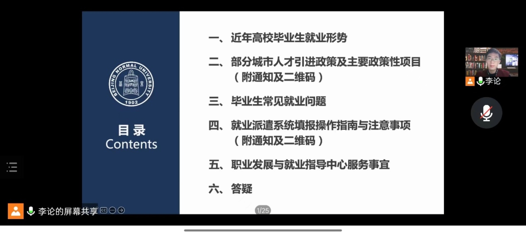 之后,李论老师主要从以下六个方面为同学们介绍了相关的就业政策。第一,对近年来高校毕业生的就业形势进行了介绍与分析,帮助同学们了解当前较为严峻的形势以及我校毕业生的主要去向。第二,为同学们介绍了我国部分城市人才引进政策以及主要的政策性项目,包括北上广深等一线城市与成都、杭州、西安等新一线城市的落户条件和落户政策,以及三支一扶、特岗教师、志愿服务西部计划、大学生参军入伍、国际组织实习项目、科研行政助力、保研等与毕业生有关的其他政策性项目。第三,对就业准备、签订三方协议、户档转迁、改派手续等毕业生常见的就业问题进行了详细介绍。第四,为同学们介绍了就业派遣系统填报的操作指南与注意事项,并提醒各位毕业生同学尽快登录就业派遣系统,完善自己的毕业信息。第五,介绍了学校就业指导中心的服务架构及其提供的各项服务,为同学们日后寻找求职帮助提供了详细指南。最后是答疑环节,针对大家目前存在的问题,李论老师与同学们进行了充分的沟通交流,并表示未来还会定期以线上会议的形式,为同学提供就业方面的指导和建议,陪伴同学们度过紧张忙碌的求职毕业季。