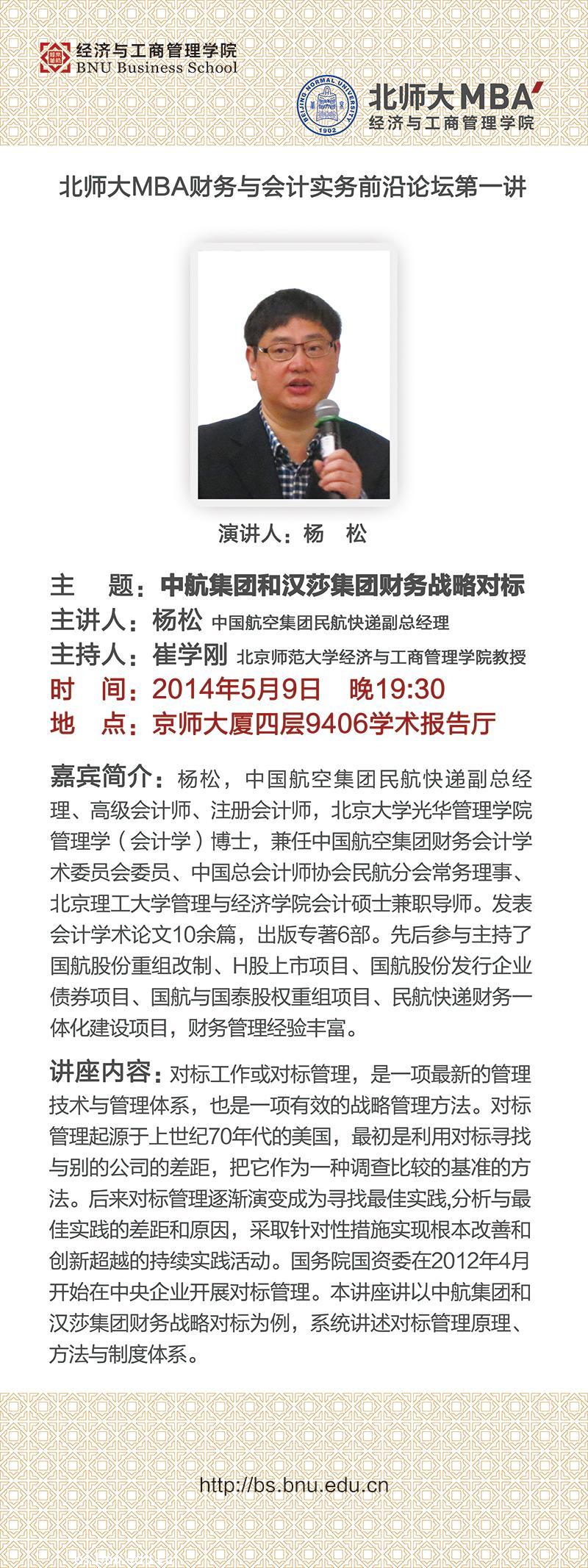 杨松,中国航空集团民航快递副总经理、高级会计师、注册会计师,北京大学光华管理学院管理学(会计学)博士,兼任中国航空集团财务会计学术委员会委员、中国总会计师协会民航分会常务理事、北京理工大学管理与经济学院会计硕士兼职导师。发表会计学术论文10余篇,出版专著6部。先后参与主持了国航股份重组改制、H股上市项目、国航股份发行企业债券项目、国航与国泰股权重组项目、民航快递财务一体化建设项目,财务管理经验丰富。