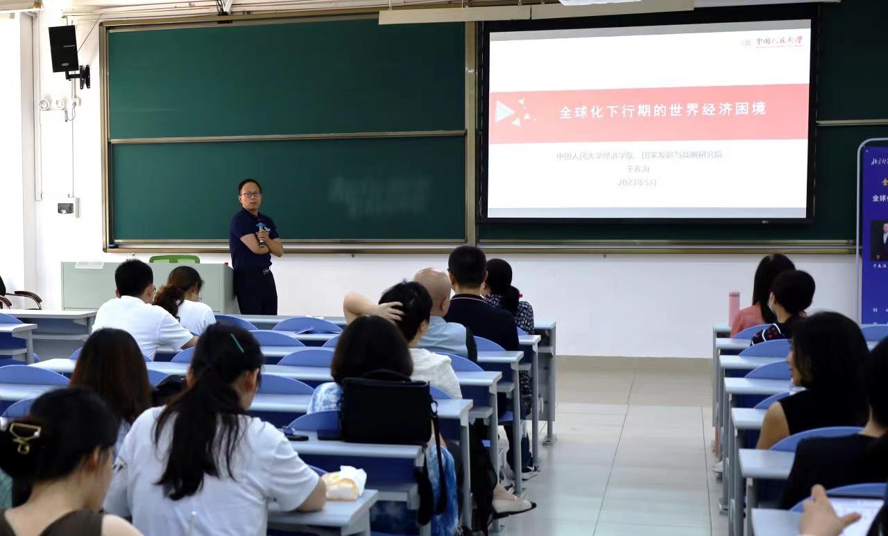 本次大讲堂邀请了中国人民大学经济学院副院长、第十三届民盟中央委员、经济委员会副主任于春海教授为师生做题为“全球化下行期的世界经济困境”的讲座。