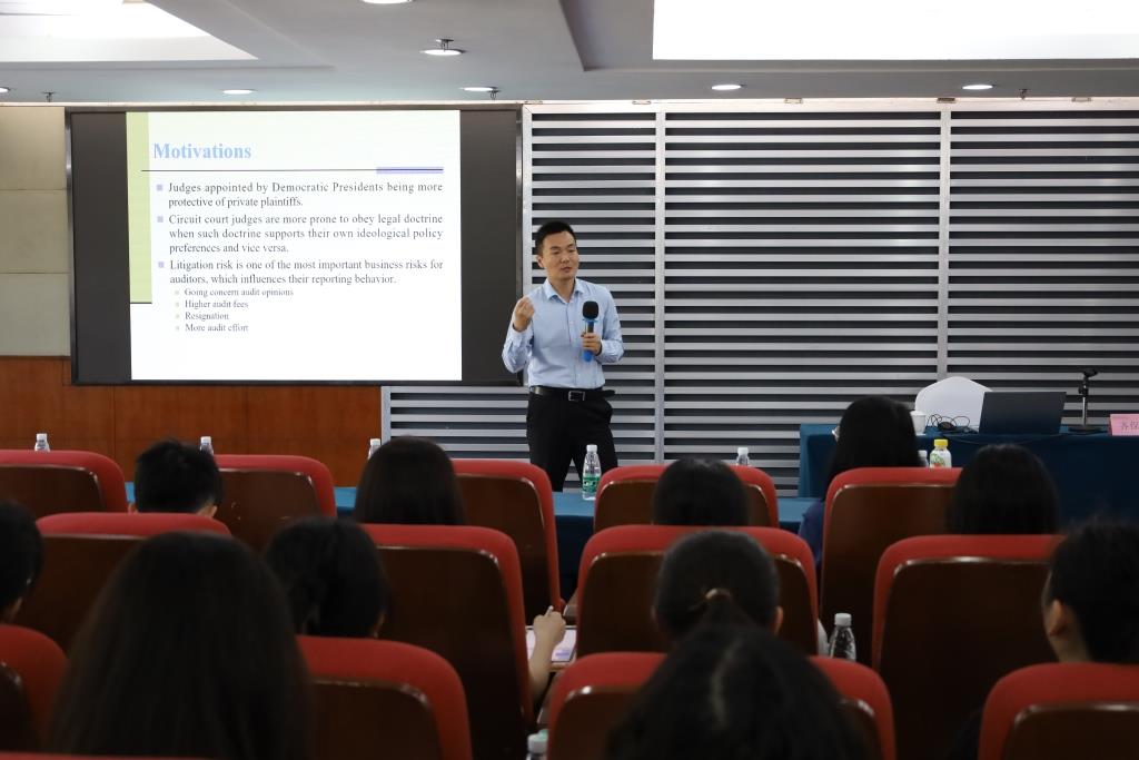 齐保垒教授年轻有为、学识渊博,以其独特的研究角度,拓展了大家的学术思维。齐教授用数据和案例为在座师生解说美国联邦法官的构成对审计行为的影响,用样本统计和模型为大家证实了民主党法官占主导优势时,诉讼风险是审计工作考虑的重要因素。民主党法官比例越大,诉讼风险就越大,费用越多。